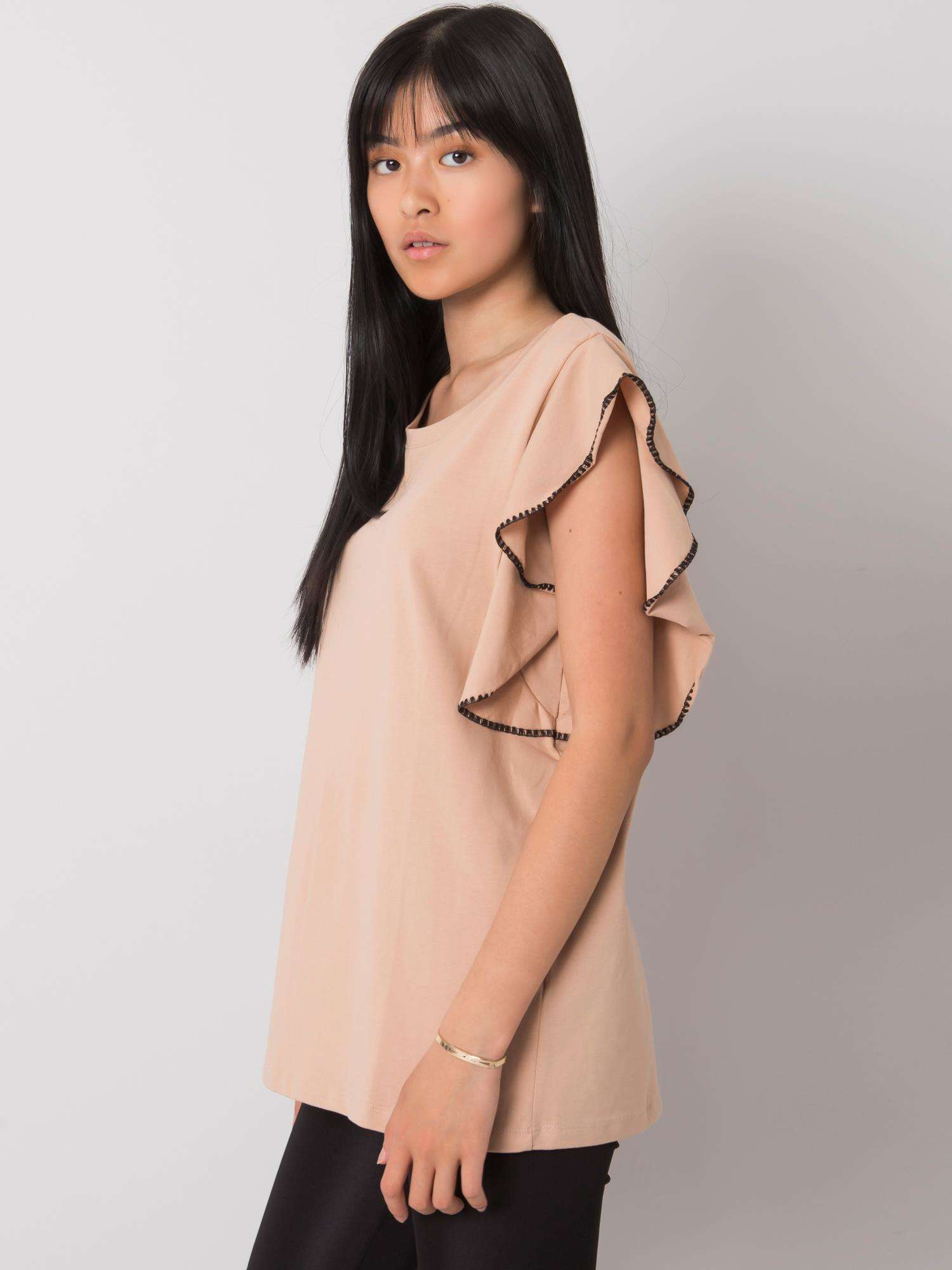 Beżowa bluzka z ozdobnymi rękawami.