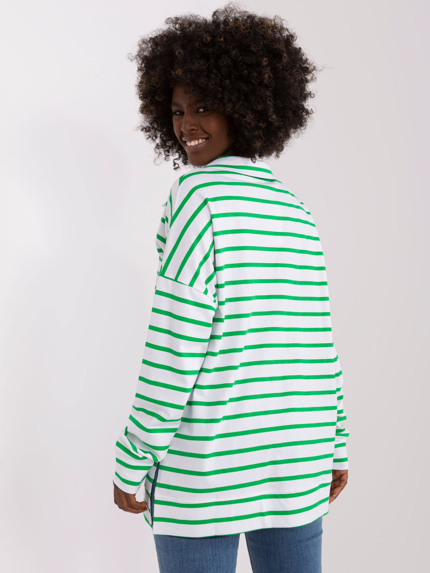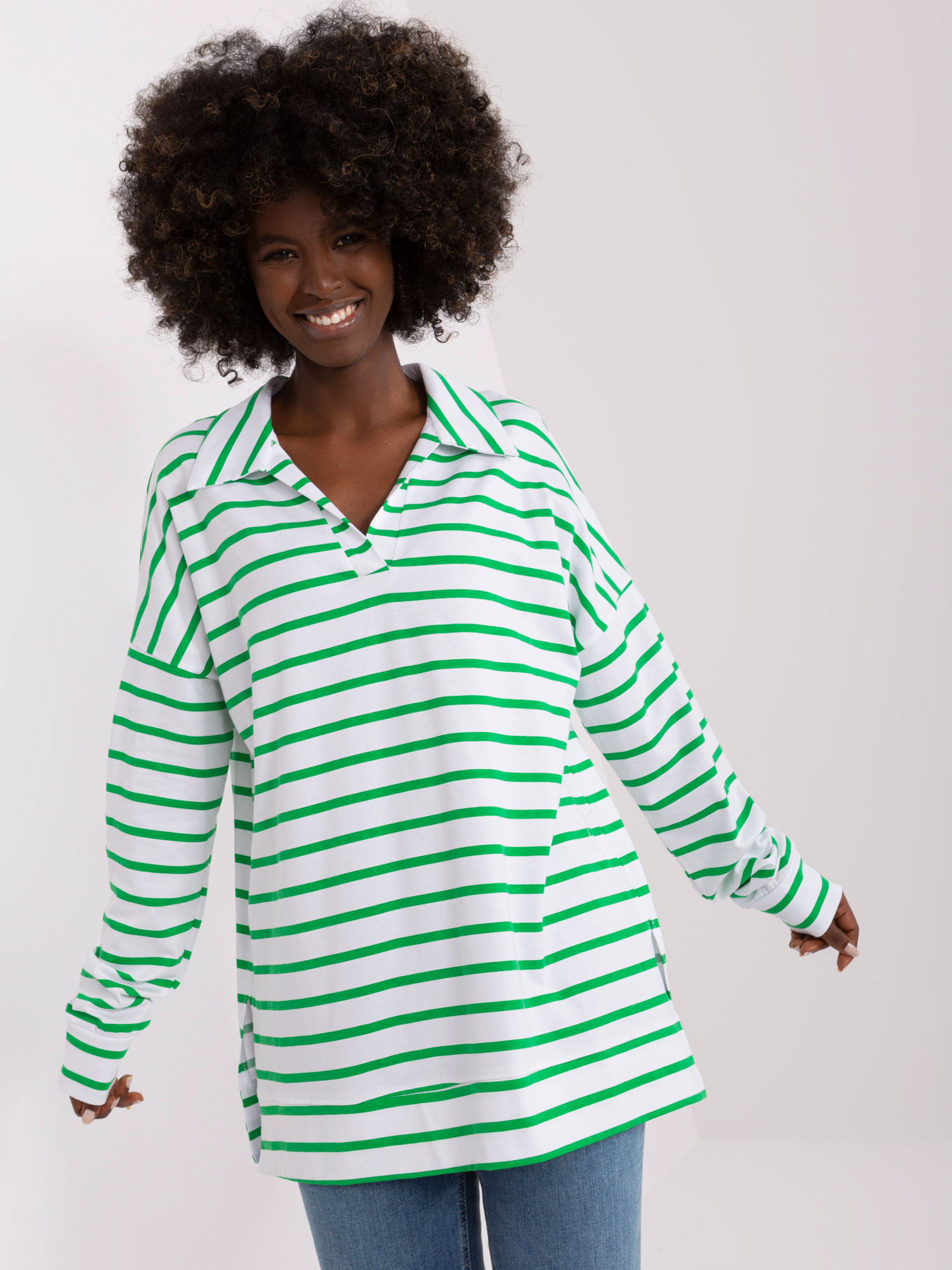 Wymiary bluzki w rozmiarze S/M mierzone na płasko: szerokość pod pachami – 60 cm, długość rękawa – 66 cm, długość całkowita – 69 cm.