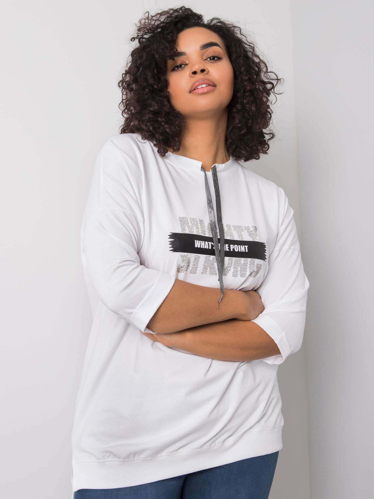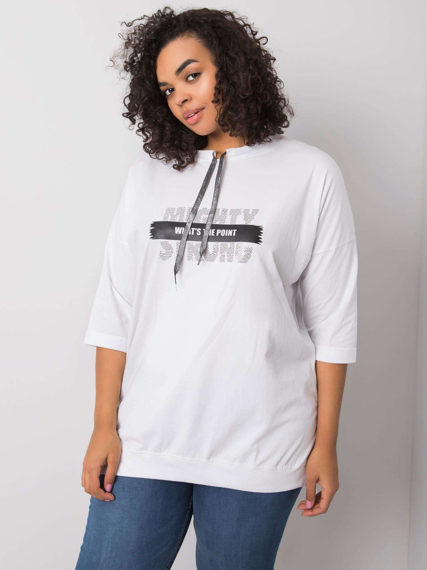 Wymiary bluzki w rozmiarze one size mierzone na płasko: szerokość pod pachami – 65 cm, długość całkowita – 77 cm, długość rękawa – 40 cm