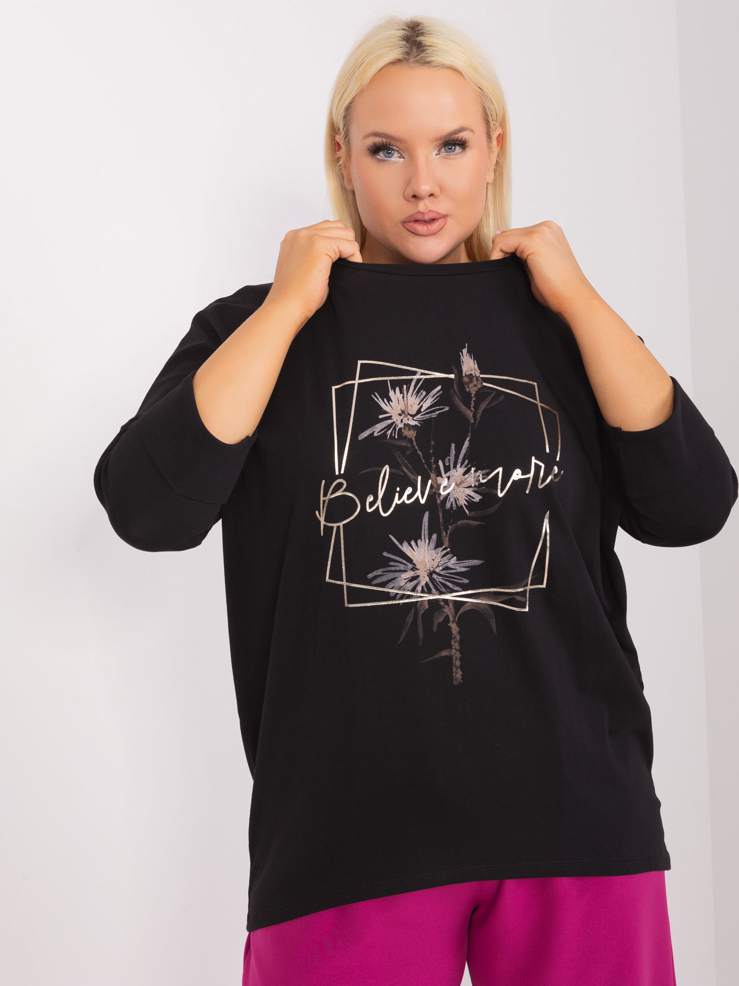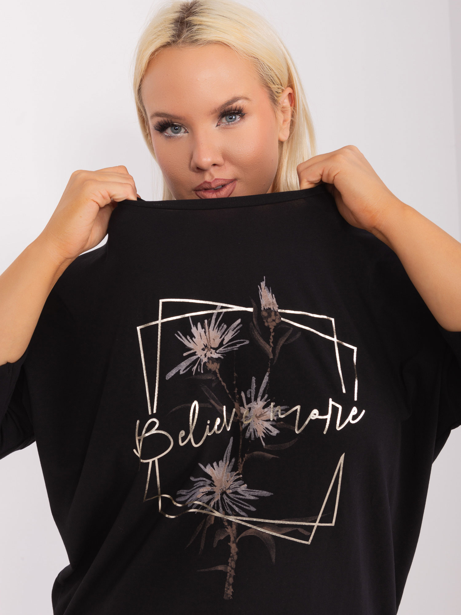 Wymiary bluzki w rozmiarze one size mierzone na płasko: szerokość pod pachami – 75 cm, długość całkowita (przód) – 70 cm, długość całkowita (tył) – 77 cm, długość rękawa – 44 cm.