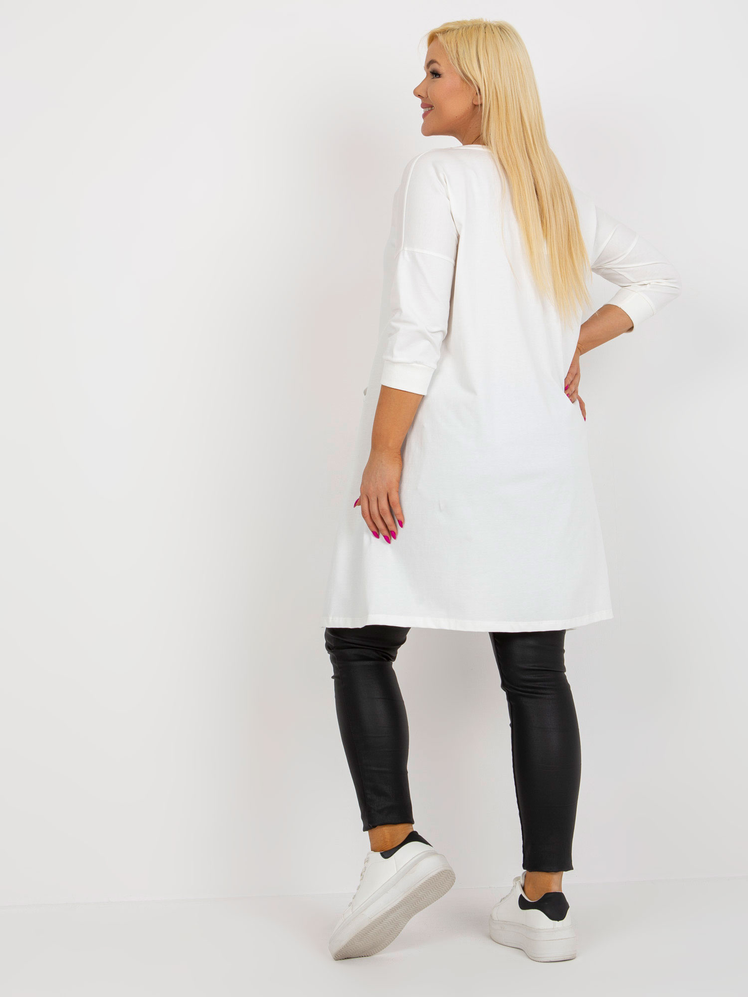 Wymiary bluzki w rozmiarze one size mierzone na płasko: szerokość pod pachami – 58 cm, długość rękawa – 42 cm, długość całkowita (przód) – 75 cm, długość całkowita (tył) – 94 cm .