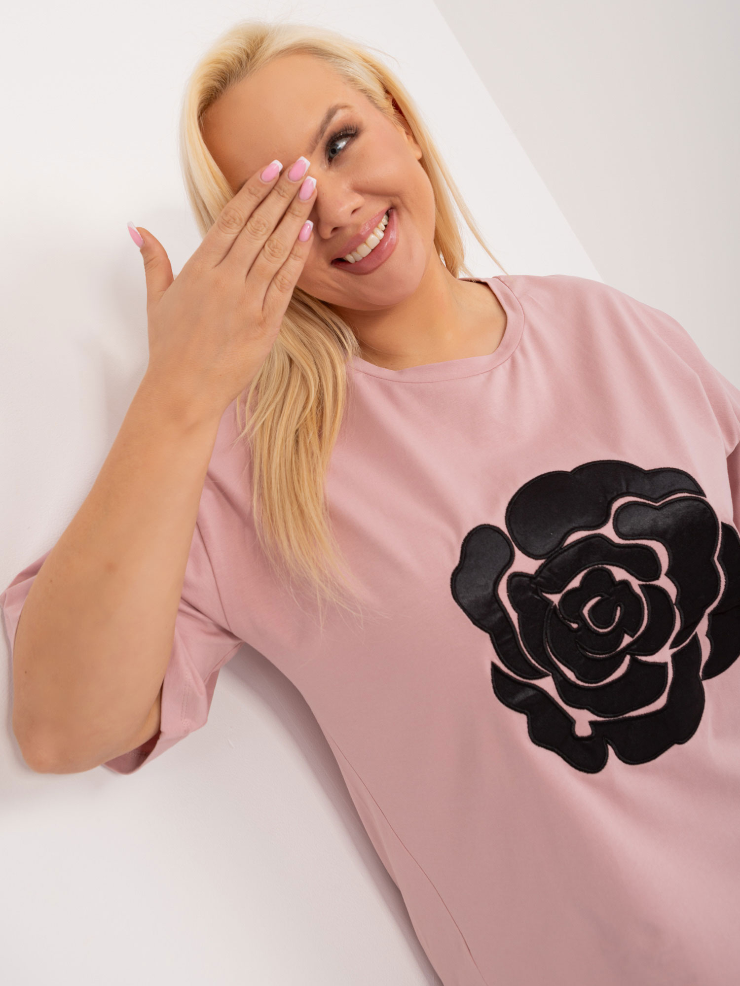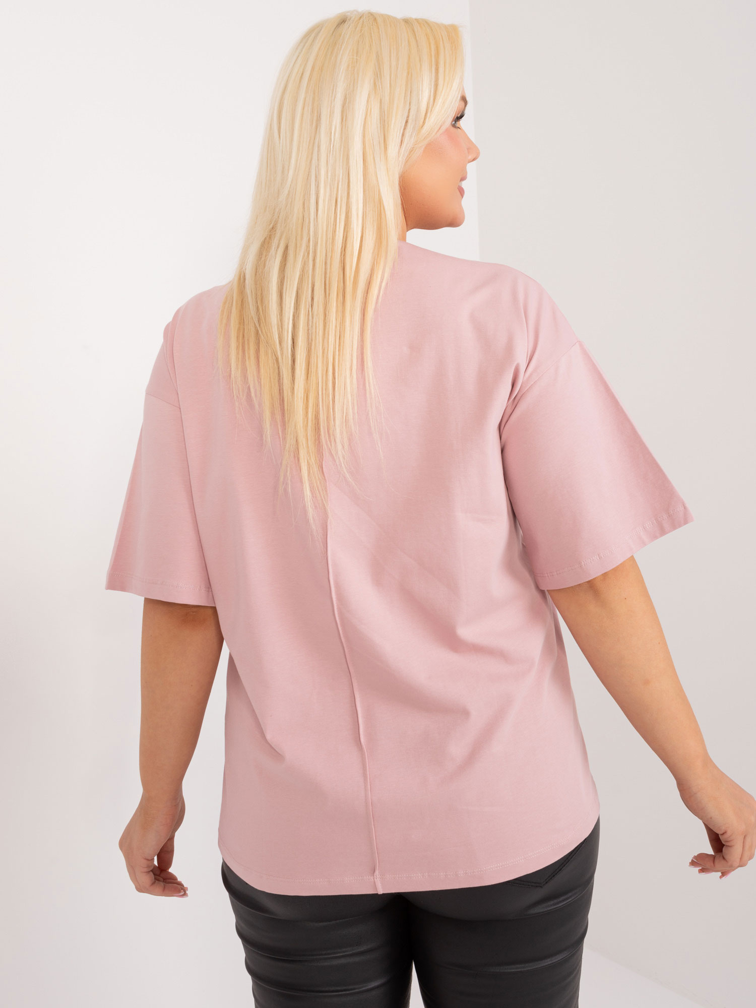 Wymiary bluzki w rozmiarze one size mierzone na płasko: szerokość pod pachami – 62 cm, długość całkowita (przód) – 67 cm, długość całkowita (tył) – 72 cm .