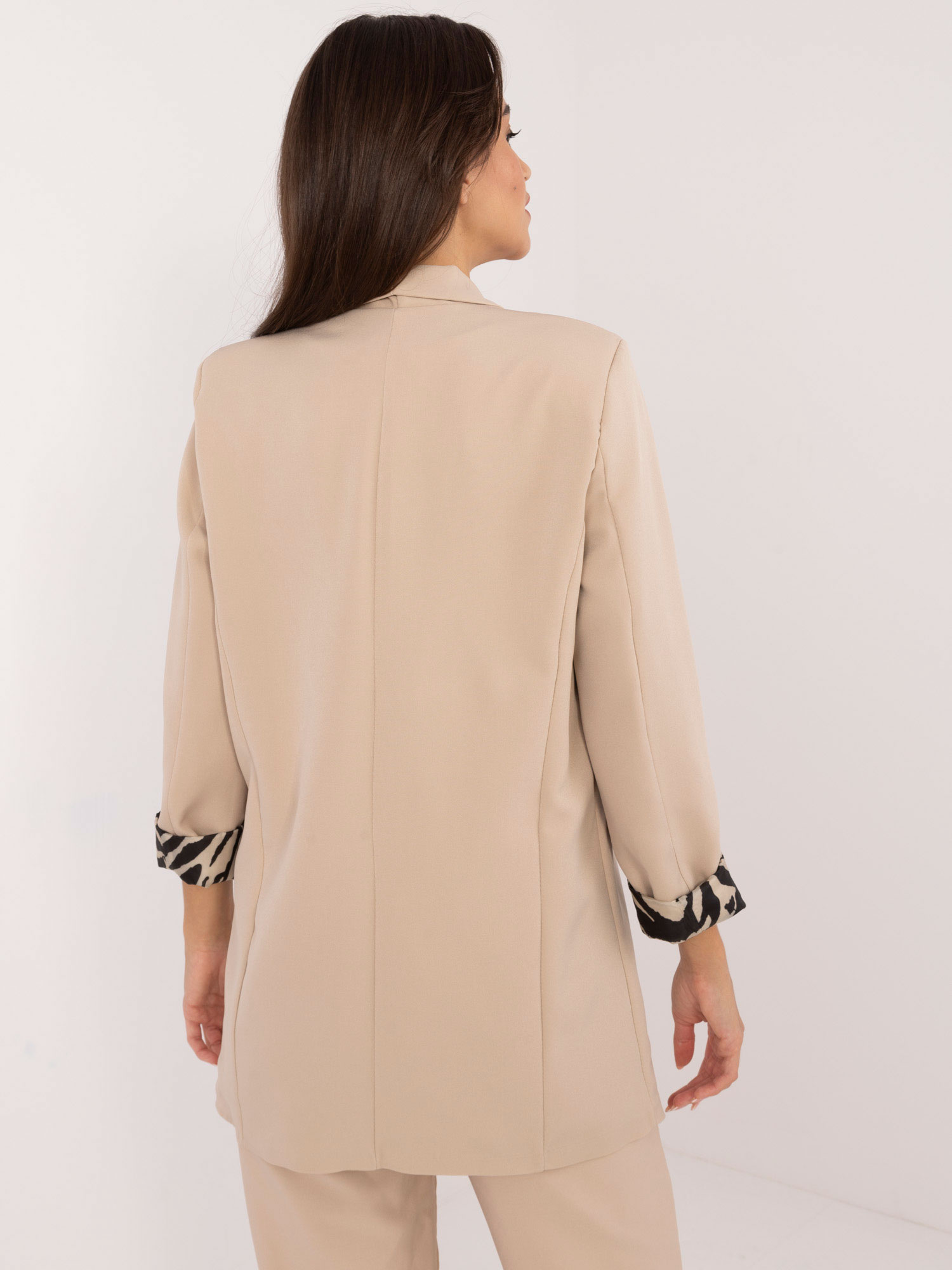 Wymiary marynarki w rozmiarze one size mierzone na płasko: szerokość pod pachami – 52 cm, długość rękawa – 56 cm, długość całkowita – 73 cm.