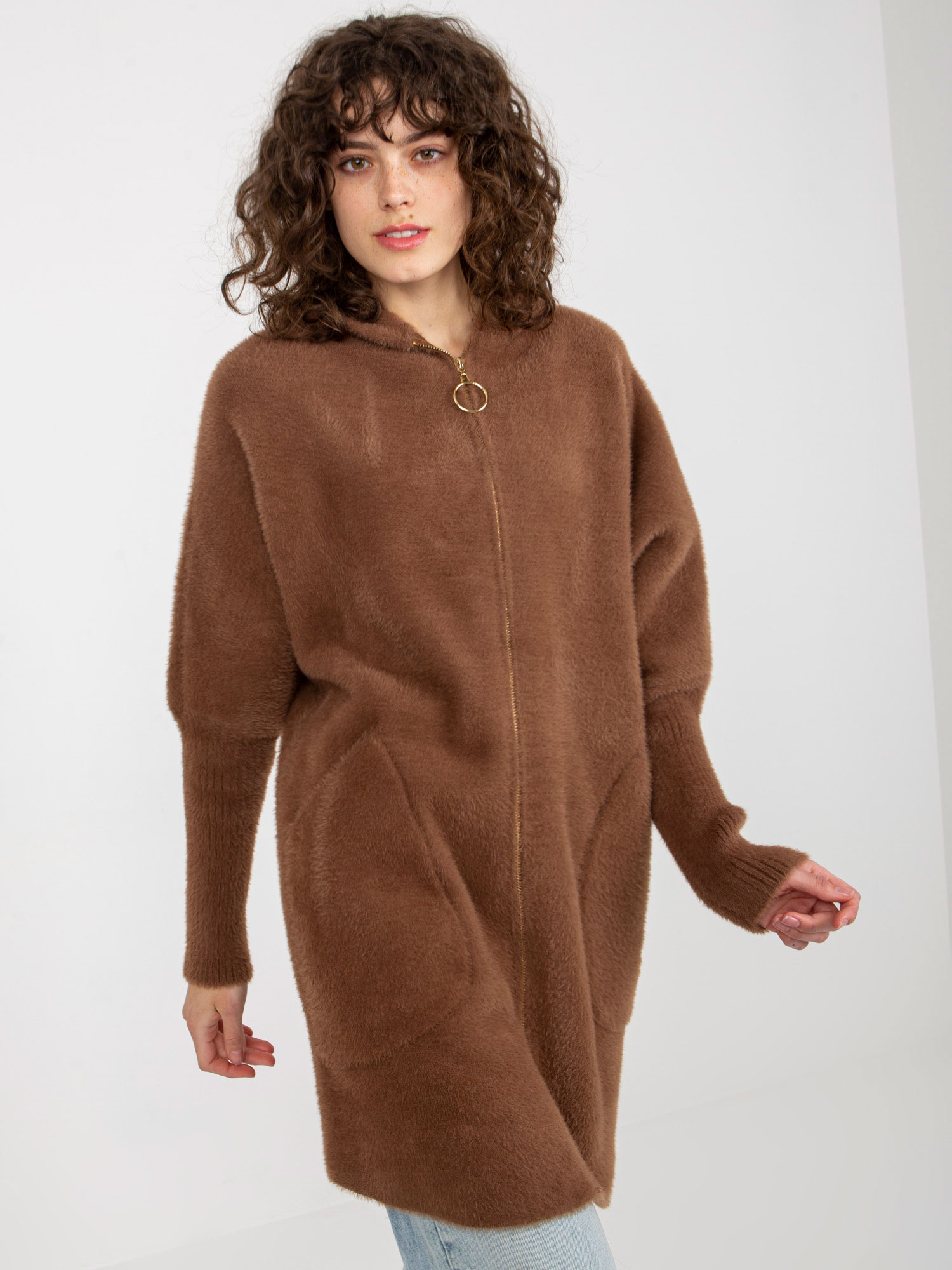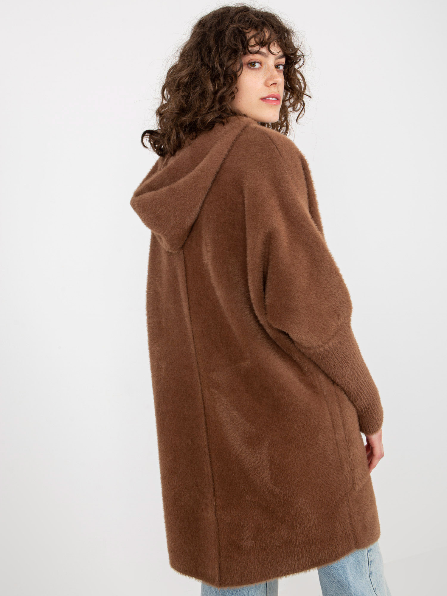 Brązowy damski płaszcz alpaka z kapturem .