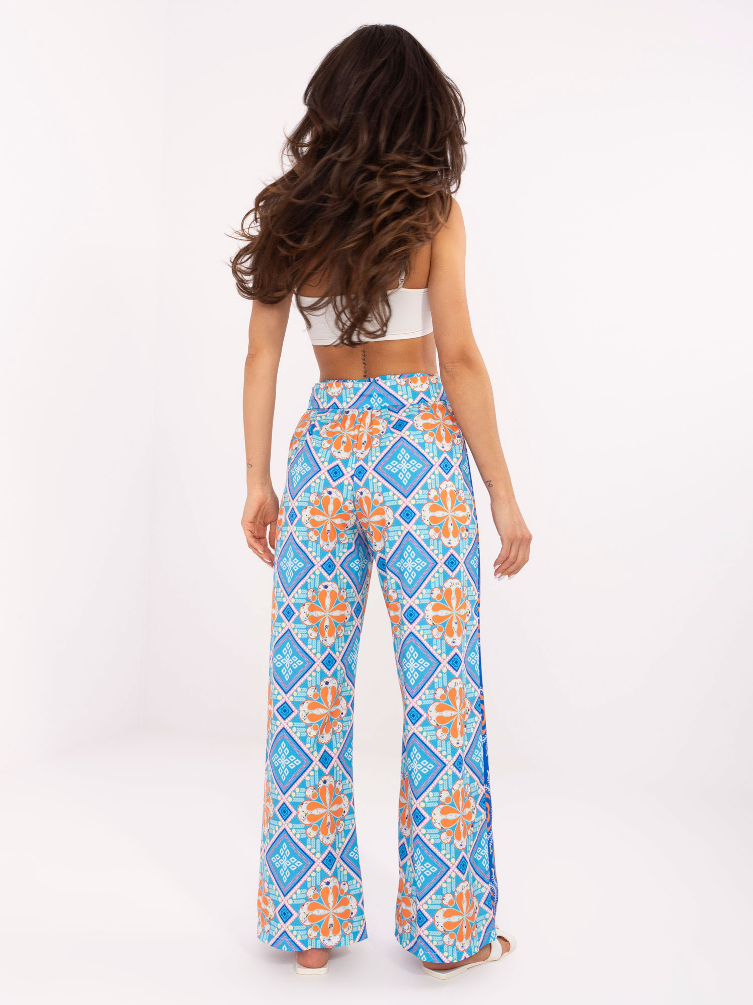 Wymiary spodni w rozmiarze one size mierzone na płasko: szerokość w pasie – 34 cm (na płasko), szerokość w pasie – 50 cm (po rozciągnięciu), wysokość stanu – 35 cm, długość całkowita – 110 cm.