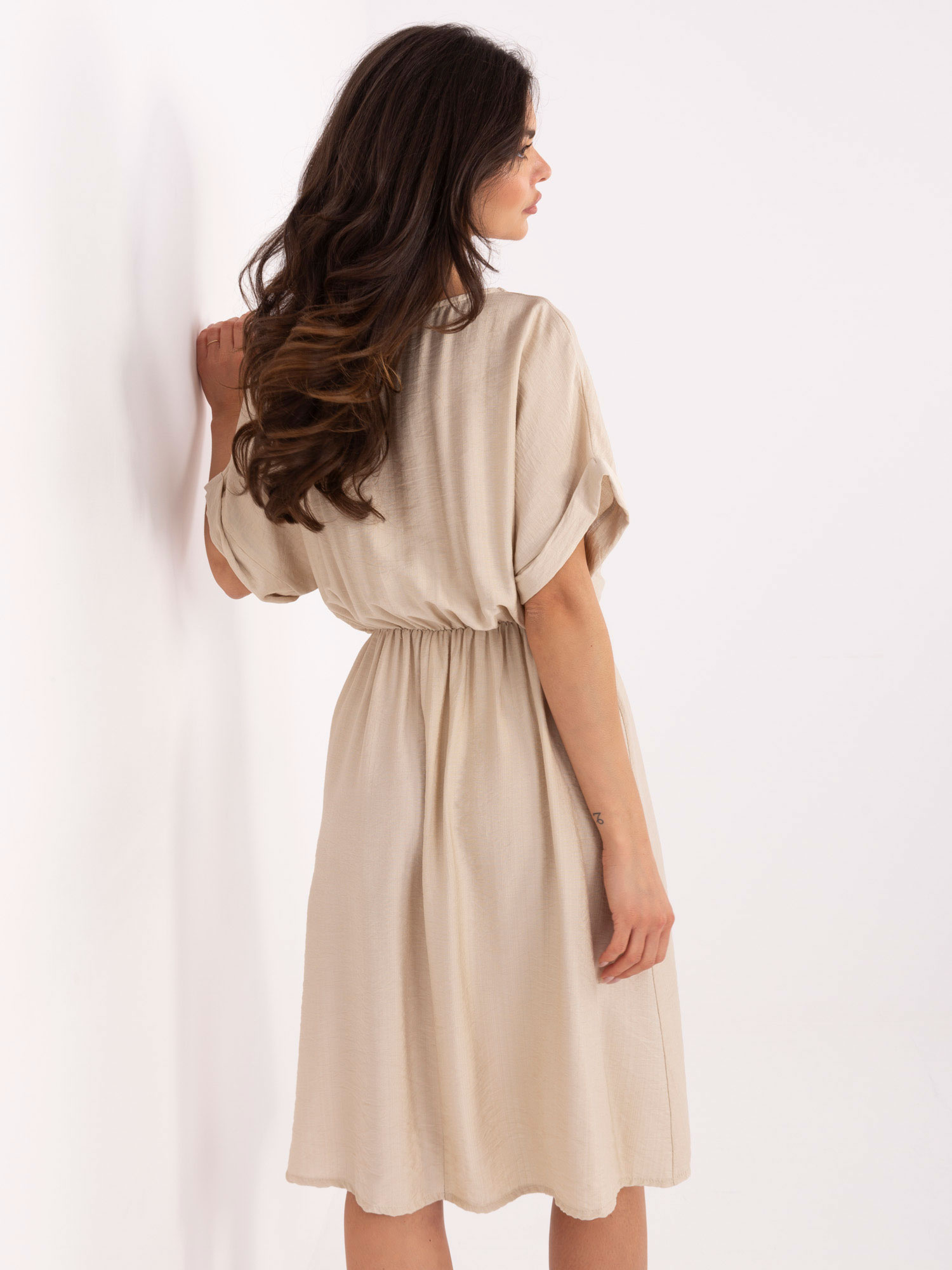 Wymiary sukienki w rozmiarze one size: szerokość pod pachami – 52 cm, szerokość w talii – 33 cm (na płasko), szerokość w talii – 59 cm (po rozciągnięciu), długość rękawa – 27 cm, szerokość w biodrach – 63 cm, długość całkowita – 106 cm.