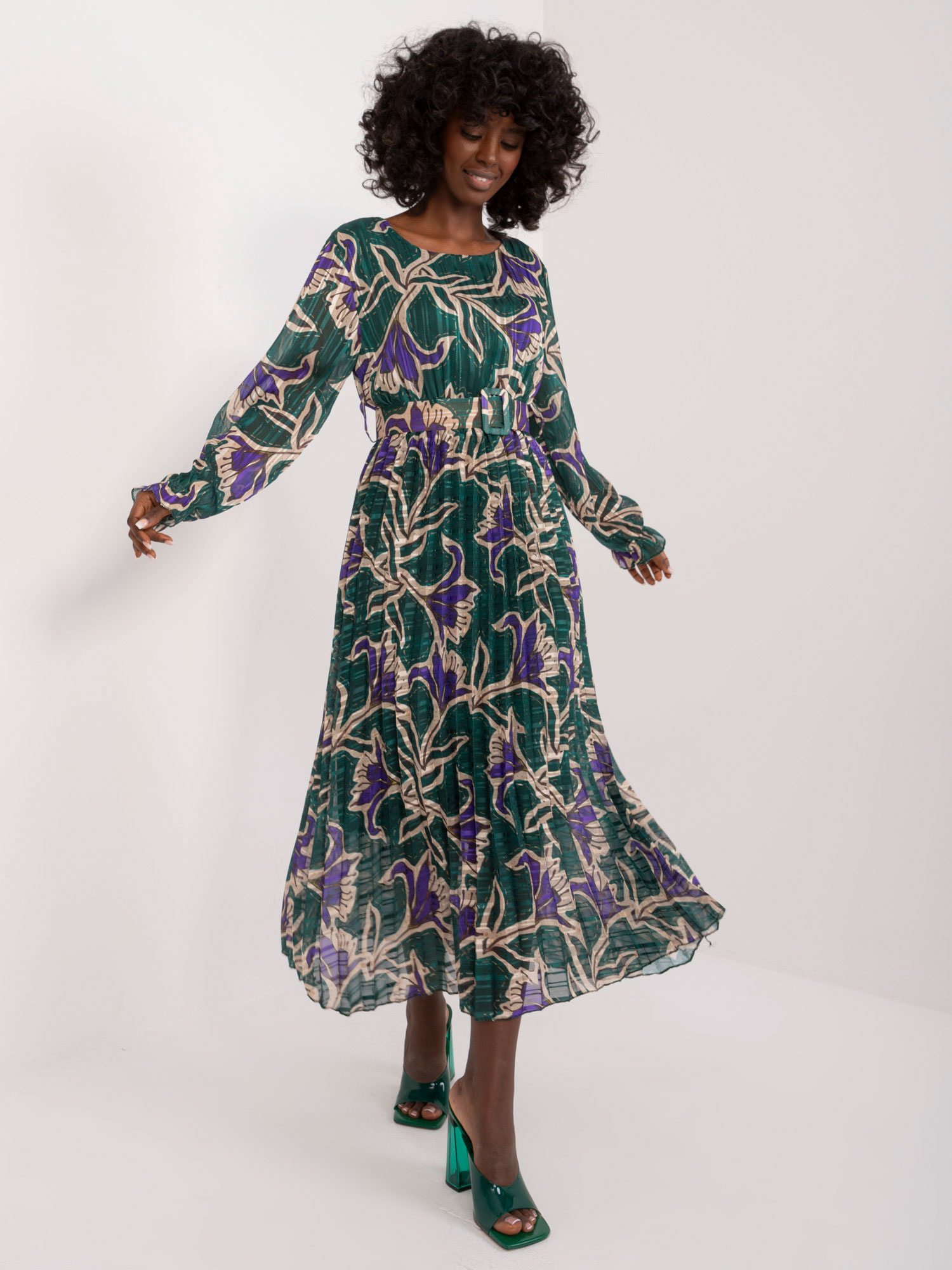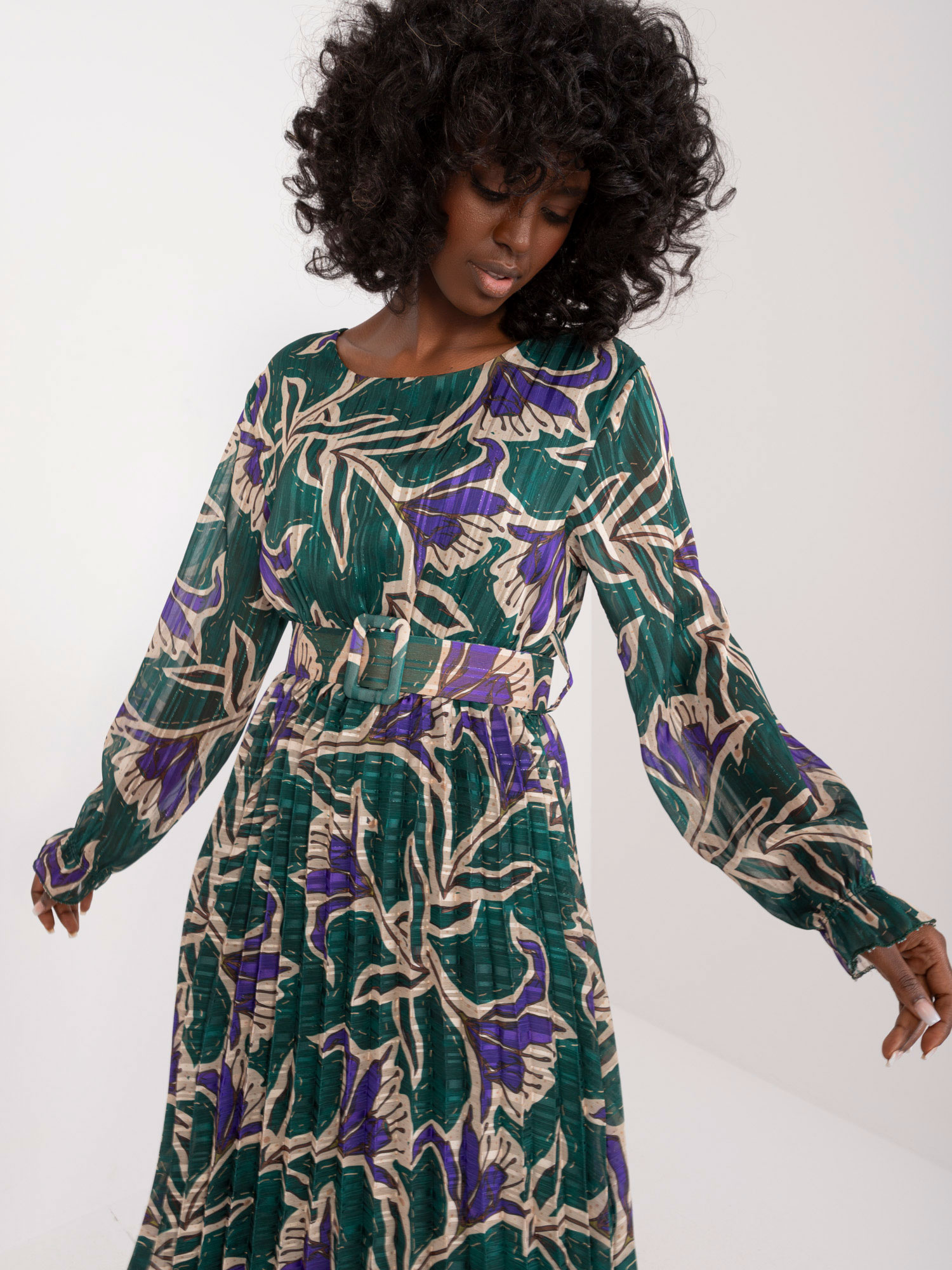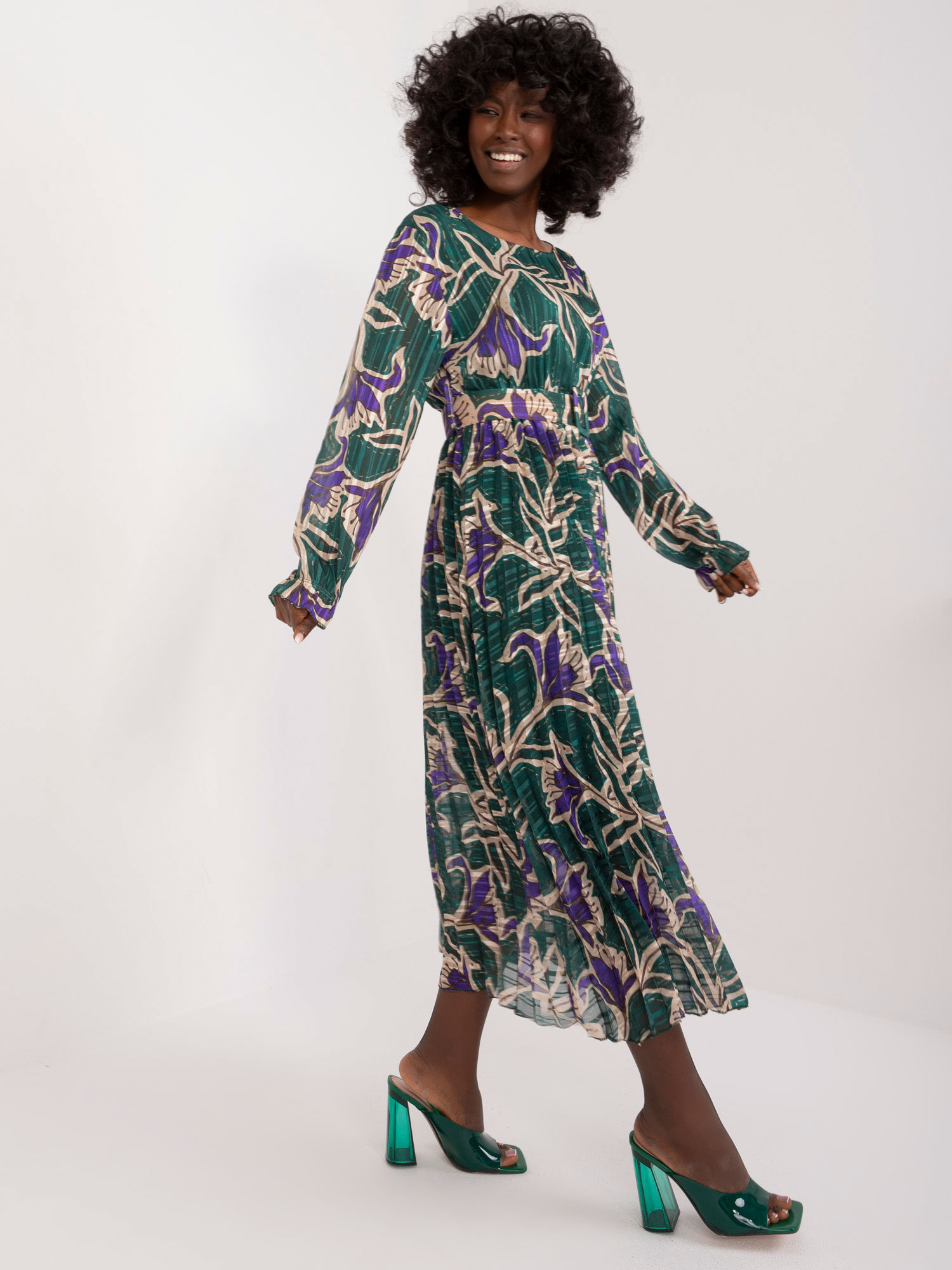 Wymiary sukienki w rozmiarze one size mierzone na płasko: szerokość pod pachami – 45 cm, długość rękawa – 59 cm, długość całkowita – 125 cm.