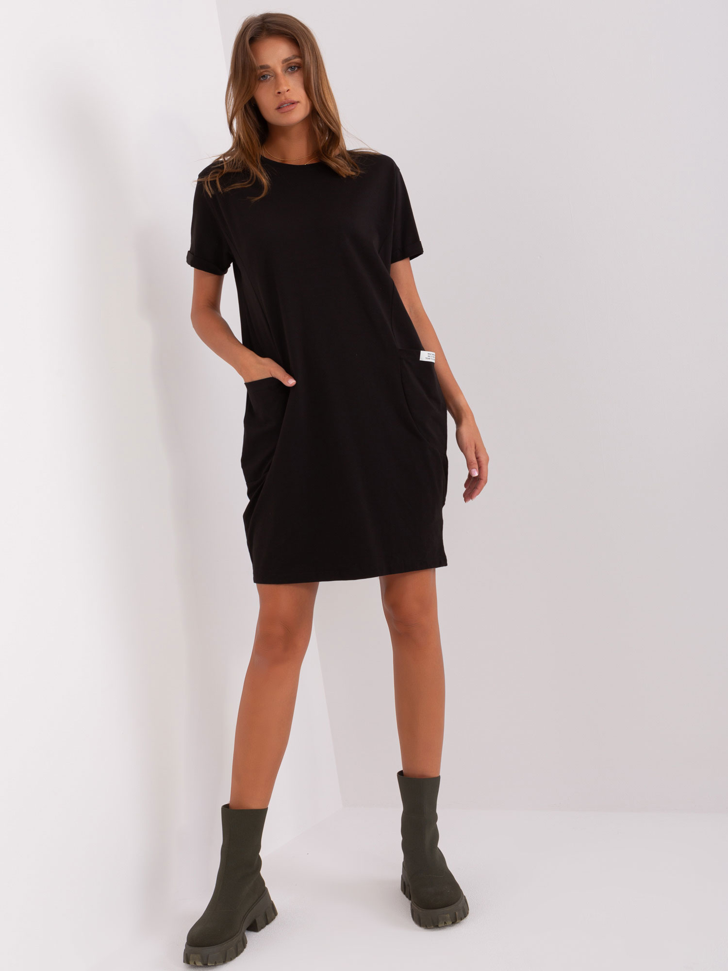 Czarna dresowa sukienka basic z krótkim rękawem .