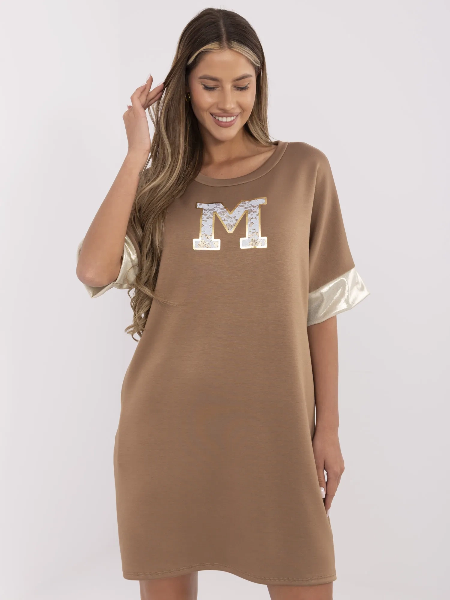 Wymiary sukienki w rozmiarze one size mierzone na płasko: szerokość pod pachami – 62 cm, długość całkowita – 92 cm, długość rękawa – 19 cm.