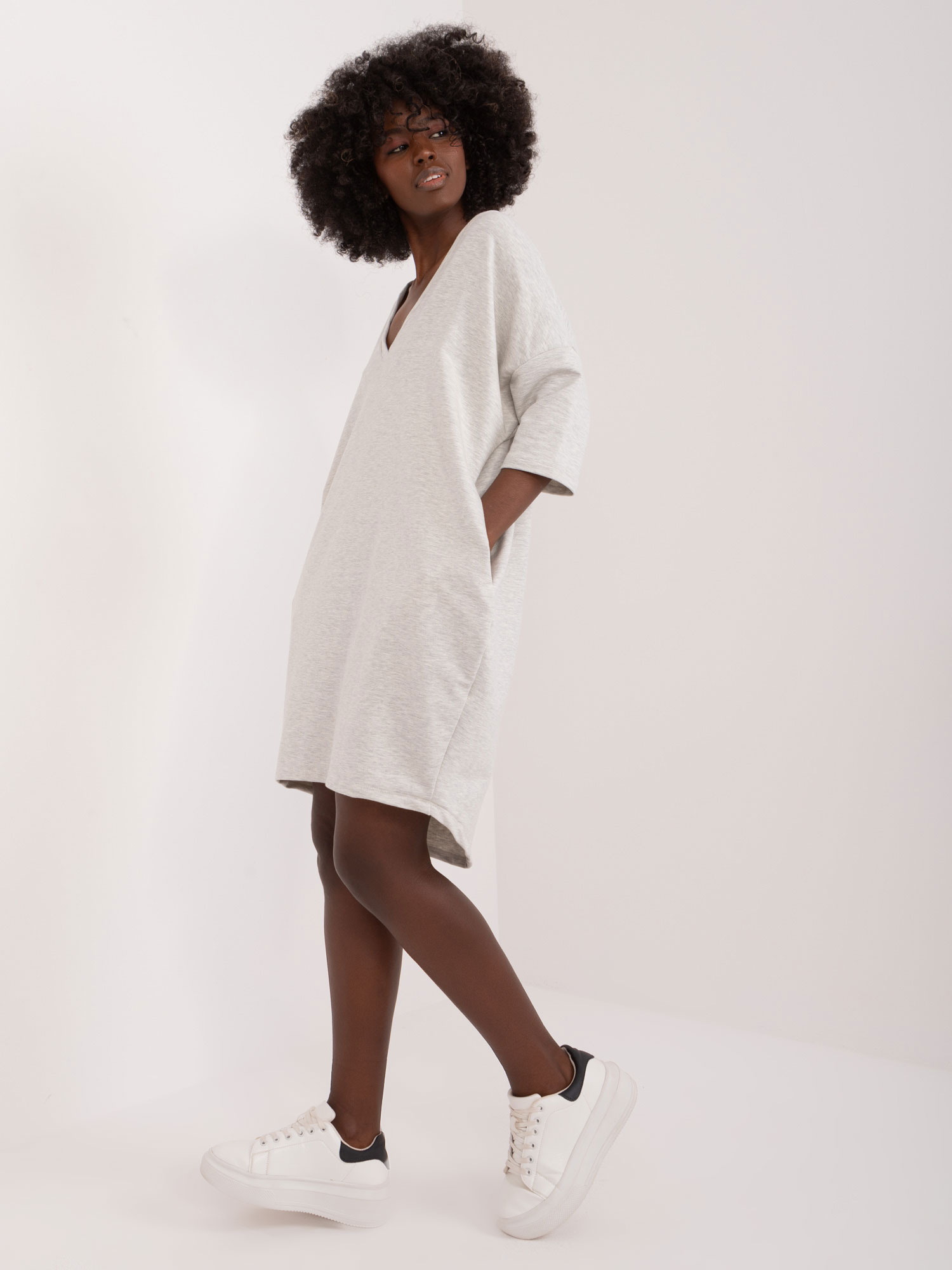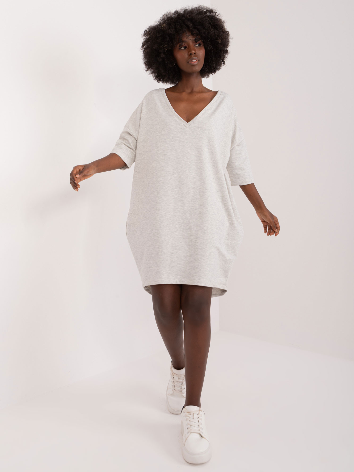 Wymiary sukienki w rozmiarze one size mierzone na płasko: szerokość pod pachami – 65 cm, długość rękawa – 35 cm, długość całkowita (przód) – 92 cm, długość całkowita (tył) – 85 cm
