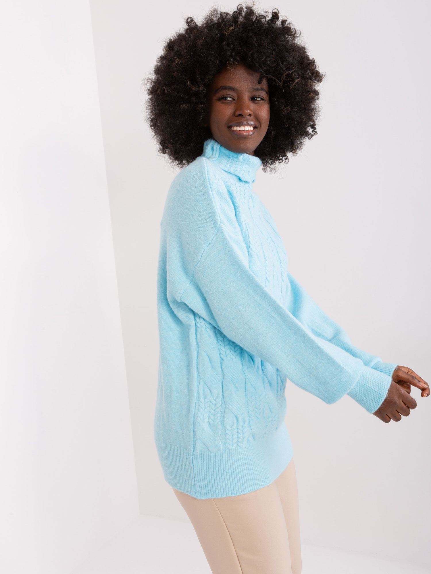 Wymiary swetra w rozmiarze one size mierzone na płasko: szerokość pod pachami – 52 cm, długość całkowita – 64 cm, długość rękawa – 59 cm.