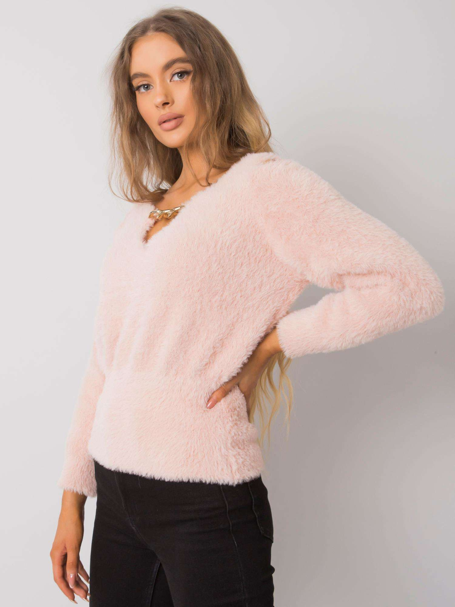 RUE PARIS Brudnoróżowy sweter z trójkątnym dekoltem.