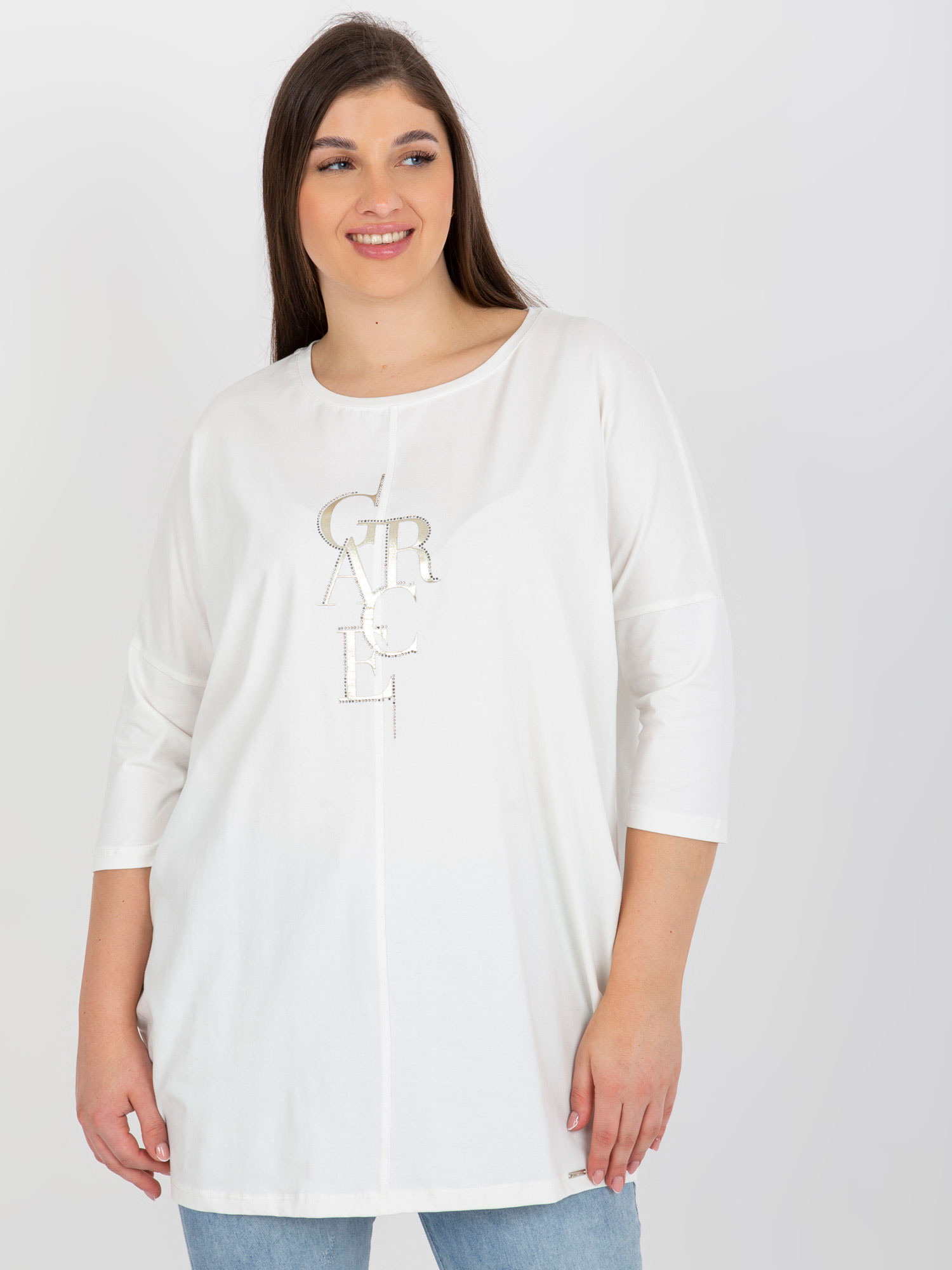 Ecru bluzka plus size z błyszczącym nadrukiem .
